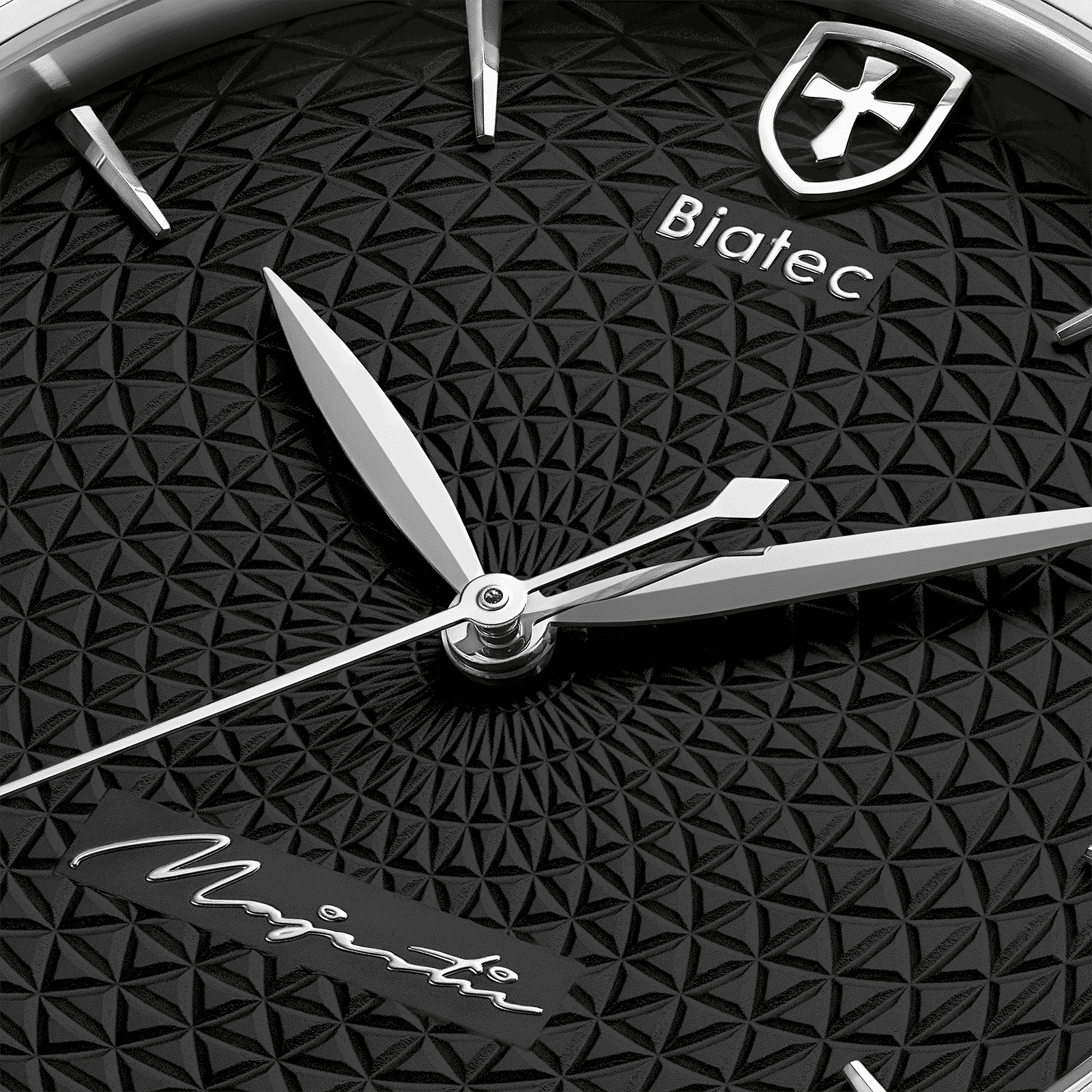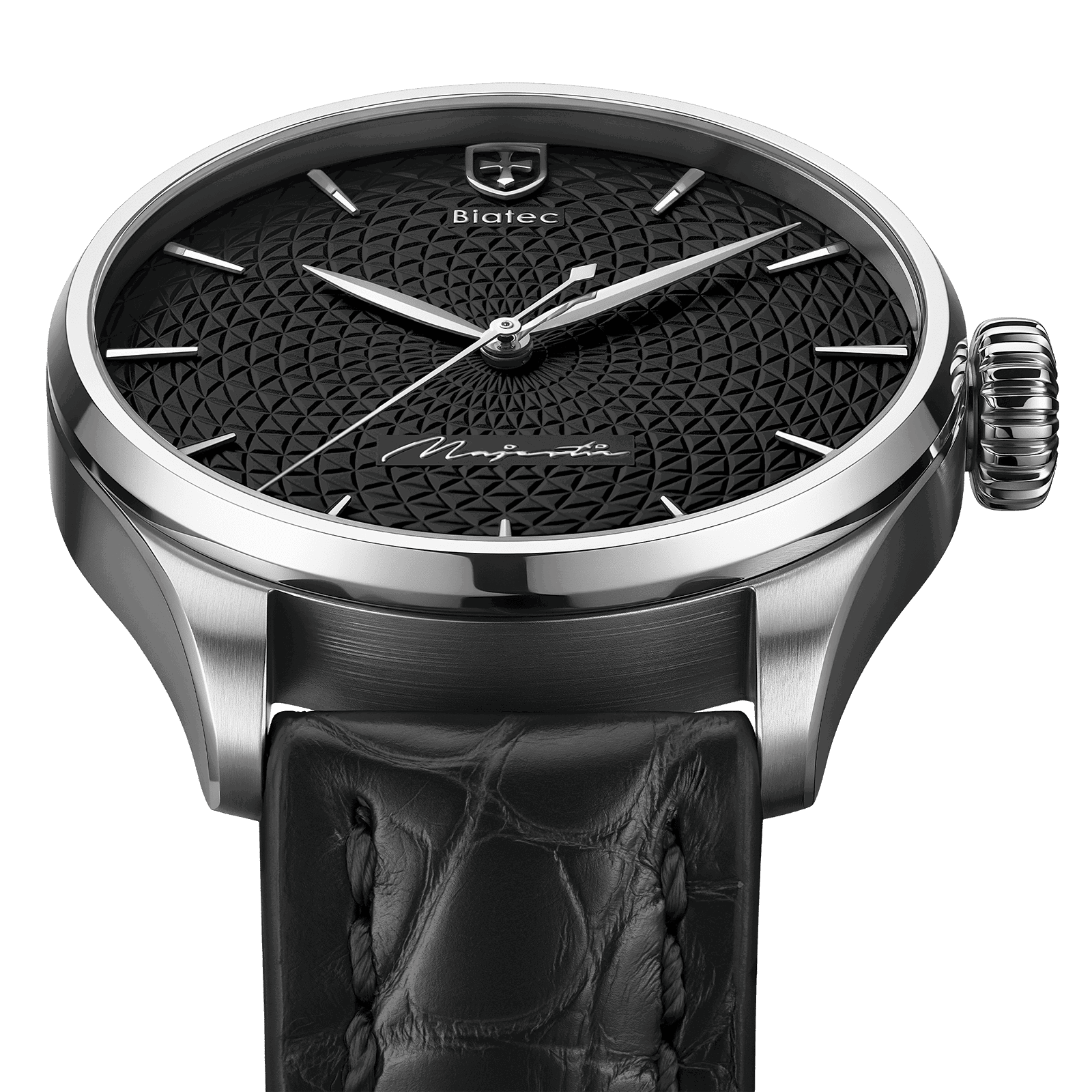 Biatec Majestic 01 N je rafinovaným nástupcom nášho obľúbeného staršieho modelu Majestic 01 F, ktorý bol "backliftovaný" pre krajší dizajn ale aj lepšie vyladenie presnosti vďaka vyšším špecifikáciám strojčeka Sellita SW200 TOP, ktorý je teraz navyše krásne zdobený perleťovaním a modrými skrutkami. Táto aktualizovaná verzia sa vyznačuje rafinovaným kruhovým vzorom na ciferníku, ktorý dodáva hlbší vzhľad a odzrkadľuje sa aj na dizajne remeselne spracovaného rotora.