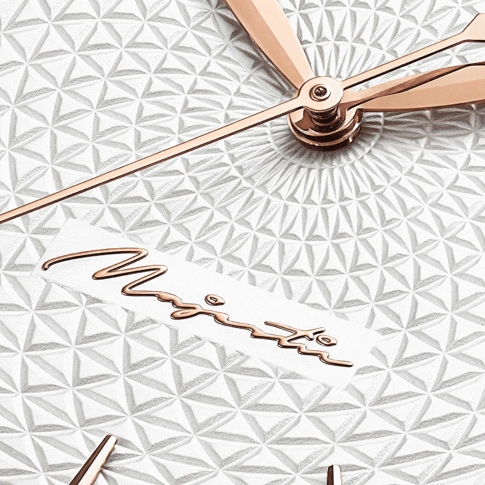 - 3D aplikované a vysokoleštené hodinové indexy v prevedení ružového zlata